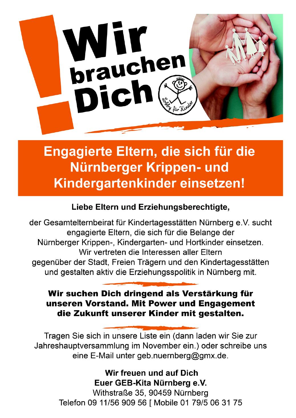 Der Gesamtelternbeirat Kindertagesstätten Nürnberg e.V. setzt sich seit 35 Jahren für die Belange unserer Nürnberger Kinder ein. Beste Bildung von Anfang an für alle Kinder sowie beste Rahmenbedingungen für jeden Beschäftigten in der Kinderbetreuung müssen an erster Stelle stehen, denn Kinder sind unser höchstes Gut, welches es zu schützen und zu fördern gilt.